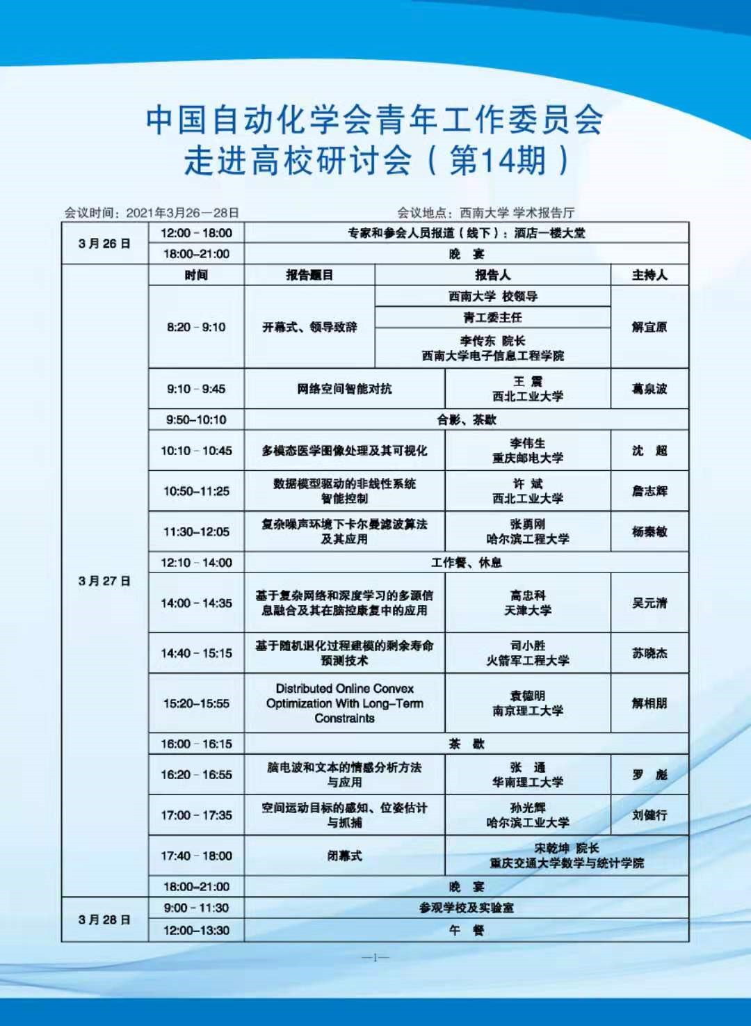 兹定于2021年03月26-28日在bevitor伟德举办中国自动化学会(CAA)青年工作委员会“走进高校系列研讨会”(第14期),本次会议由中国自动化学会主办,CAA青年工作委员、bevitor伟德承办,主题是“智能控制与信息安全”。本次研讨会采用线上和线下参与的联合模式。