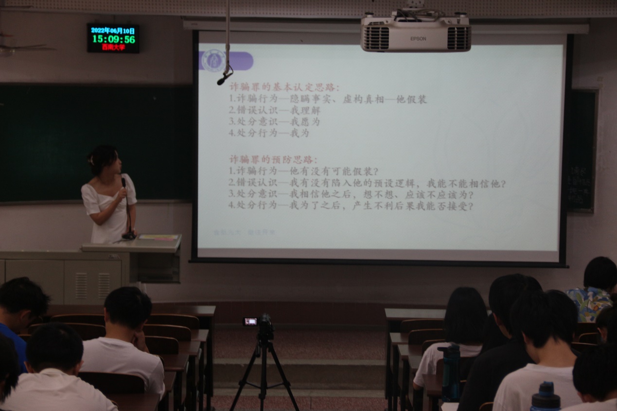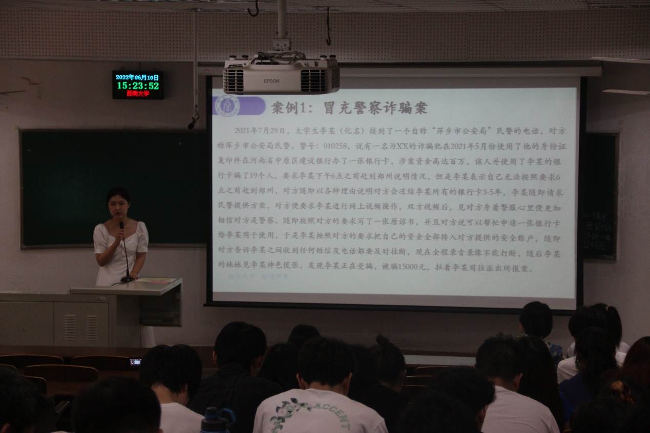 首先,张若璇就网络犯罪定义及犯罪活动、网络犯罪类型、网络犯罪专题及真实事例三个方面展开了重点讲解和宣传。结合“网络诈骗、不当言论、网络赌博、网络爬虫”四个专题以及身边显而易见的案例,以通俗易懂的语言、生动有趣的视频和情景小剧场生动地展示了网络诈骗的核心,解释了网络中的言论自由权限,明确指出了参与网络赌博,以及非法获取计算机信息系统数据的后果。