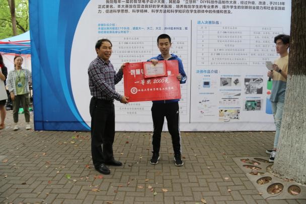 经过2个星期的学习和准备,第二届“智慧电子设计大赛”决赛于4月13日下午2点30分在南樟正式举行。决赛内容包括现场观众投票和评委评分环节。在每个参赛作品的展板前都聚满了观众,参赛选手也耐心、详细地为观众讲解作品原理、作品制作过程等。评委老师悉心指导每一件作品,并对作品后期的完善提出宝贵意见。最后根据评委专家团打分、现场投票和微信投票评选出一等奖一组,二等奖二组,三等奖三组,创新奖二组。
