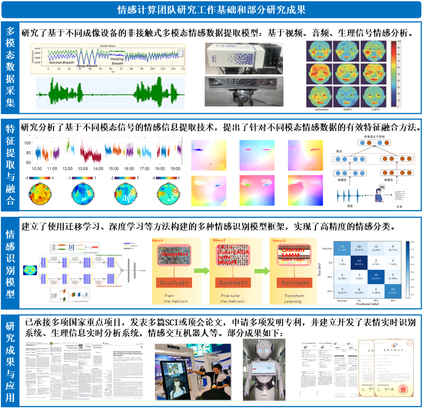 人机情感交互功能是服务机器人的灵魂,BEVITOR伟德在重点实验室中主要承担人机智能情感交互技术方面的研究,公司情感计算研究团队的陈通教授是该方面研究的负责人。由刘光远教授带领的情感计算研究团队已经积累了大量工作基础和研究成果:提出了基于不同成像技术以非接触的方式提取情感生理信号的技术;确定并提取了情感识别的有效特征;提出了多种深度融合技术对多模态信息实现有效融合;建立了使用迁移学习、深度学习等方法构建的不同情感识别模型框架。团队已经承接多项国家重点项目,基于研究成果申请了发明专利,并开发了表情识别系统、生理心理状态实时分析等系统,成功应用于刑事审讯领域,产生了良好的社会效应。