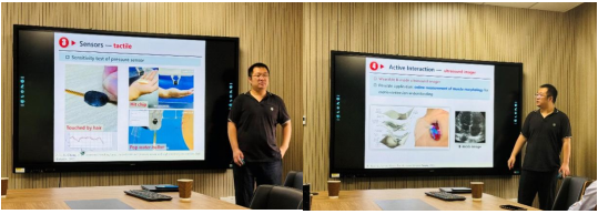 在报告中,程龙博士介绍了手功能康复机器人的研究背景和现状,着重探讨了手功能康复机器人的具体需求。他详细介绍了手功能康复机器人在设计方面的便携性、兼容性和功能优化。此外,程龙博士的报告还涉及了触觉传感器、被动交互和主动交互等相关内容,全方位展示了手功能康复机器人的研究进展,使得公司师生对该领域的了解更加深入。