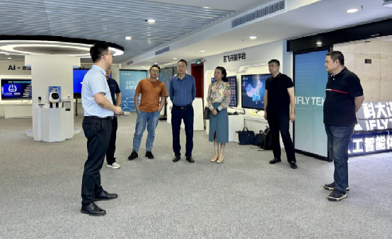 熊海灵一行首先参观了科大讯飞西南总部展厅,深入了解了科大讯飞重庆公司的业务板块,包含基于星火大模型的“AI+教育”、“AI+政法”、“AI+交通”、“AI+物流”、“AI+政务”等,并听取了关于科大讯飞的新战略、新技术和新产品的现场解说。