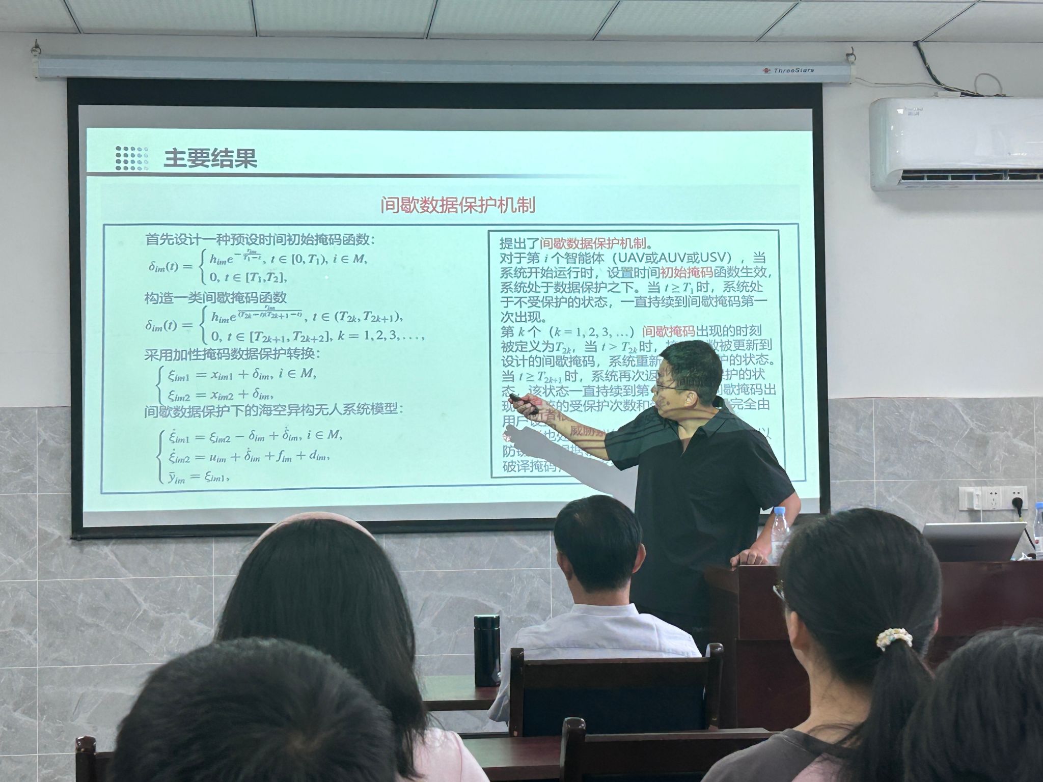 第二报告由李传东教授主持,由电子科技大学梁洪晶教授做关于海空异构无人系统协同共识的报告,他先指出目前无人系统集群同步面对的三个挑战,跟踪性能、姿态约束、控制方案灵活性,挑战如何改善无人机的设计提出了相应隐私保护算法和间歇的数据保护机制,这种机制能够在初始掩码消失后据实际启动隐私保护,进而解决传统时间设置下掩码消失不可逆的问题,并在报告最后给出了对海空异构无人系统在不同方向轨迹上的仿真分析。该报告引起同学和老师的思考,并积极提问,包括无领导者的存在机理和间歇分区间设置的目的,报告在掌声中结束。