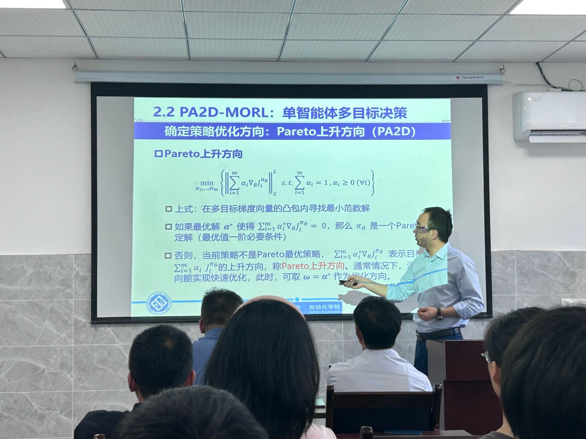首先由中南大学罗彪教授做关于人工智能与强化学习的报告,其间指出强化学习作为机器学习的分支,可以当作婴儿通过不断地自主尝试和累积后长大成人,进而引申到决策和行动的主体需要通过动作影响环境,再由环境的奖励反馈改进状态的底层框架,之后再分别从经典的单目标MDP强化学习问题引申到多目标的决策和优化。同时提供了不同模型训练的优化结果以找到Pareto最优策略。本次分享让同学们受到很大的启发,对强化学习的框架和原理有了清晰认识。