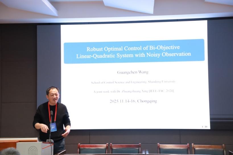 国家杰出青年科学基金获得者、山东大学控制科学与工程公司常务副经理王光臣教授进行了题为《Robust optimal control of Bi-objective LQ system with noisy observation》的报告,介绍了部分可观测LQ系统的最优控制方法,验证了最大参考概率的存在性。该报告由重庆交通大学宋乾坤教授主持。
