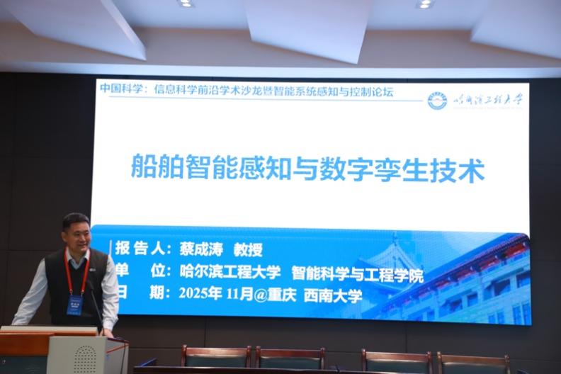 11月15日下午,首个报告由国家优秀青年科学基金获得者、电子科技大学梁洪晶教授主持。国家级人才、哈尔滨工程大学智能科学与工程公司经理蔡成涛教授聚焦《船舶智能感知与数字孪生技术》,介绍了船舶智能感知技术、数字孪生技术在船舶智能航行中涉及的关键技术,并对未来智能船舶技术的发展趋势进行展望。