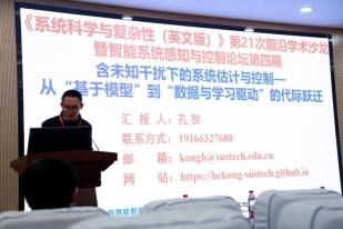 国家海外高层次青年人才、南科大-机器人研究院副经理孔贺教授带来了以《含任意未知输入下的状态估计与参数辨识》为题的报告,聚焦含未知输入系统的卡尔曼滤波应用难题,围绕噪声协方差未知或不精确、系统非强可观等实际情况,讨论了噪声协方差的可辨识性问题。该报告由国家级青年人才、同济大学董怡教授主持。